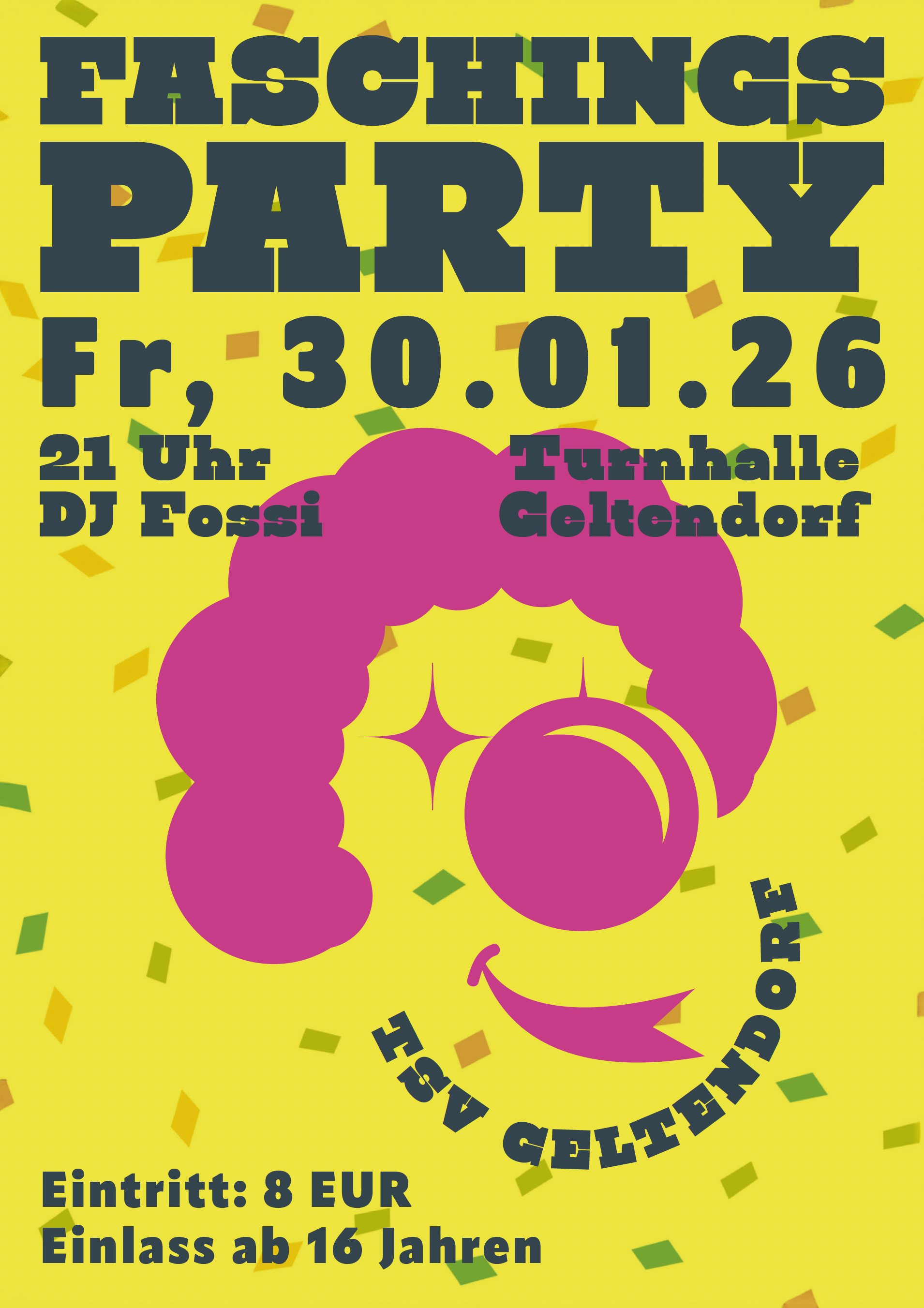 Es ist endlich wieder soweit! Der TSV Geltendorf lädt euch auch im Jahr 2026 zur legendären Faschingsparty ein!